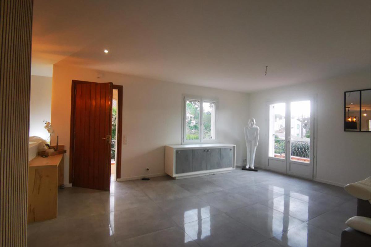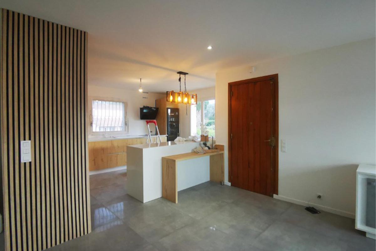 Démolition: de différentes cloisons pour optimiser l’espace à vivre (cuisine, séjour, salon).